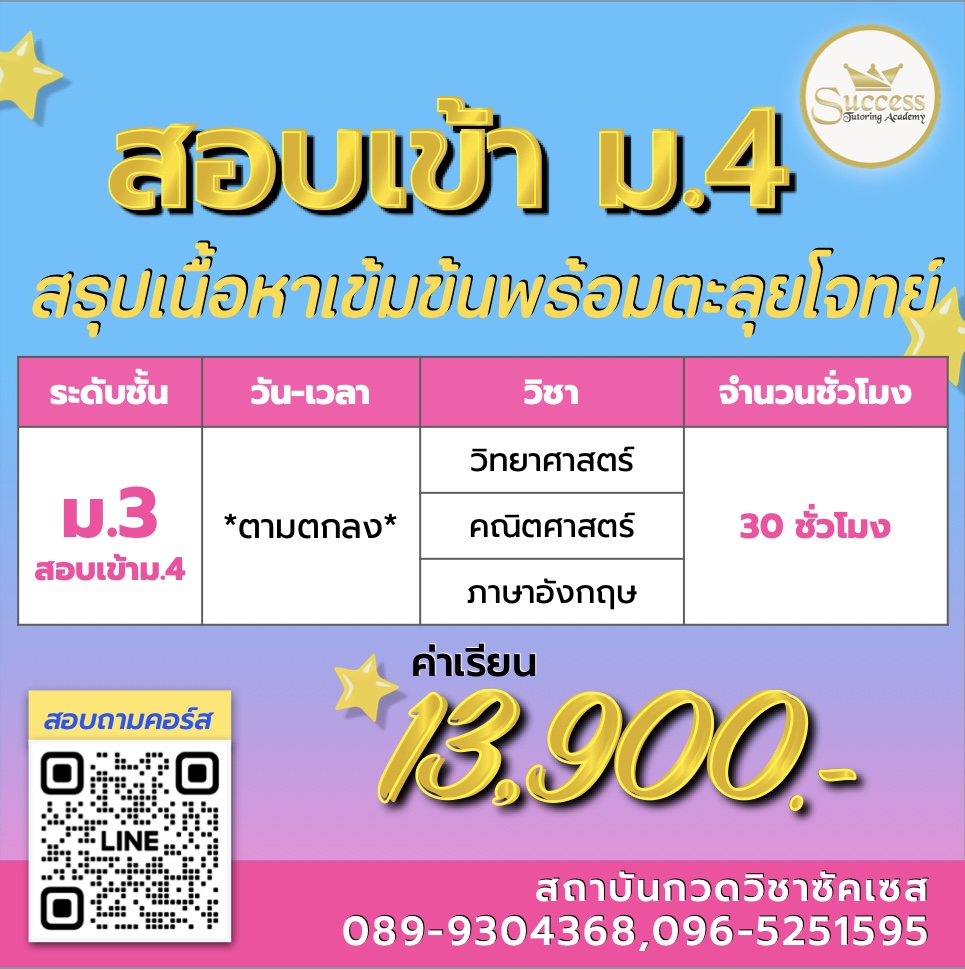 🍿คอร์ส ม.3 สอบเข้า ม.4 รายละเอียดคอร์สเรียน ระดับชั้น ม.3 สอบเข้า ม.4 ของสถาบัน ติวสด เนื้อหาเข้มข้น โดยเน้นส่วนที่ต้องใช้เตรียมสอบเข้า แนวโจทย์เช็กความเข้าใจและตะลุยโจทย์สอบเข้า เปิดรับสมัคร คอร์สม.3 สอบเข้า ม.4